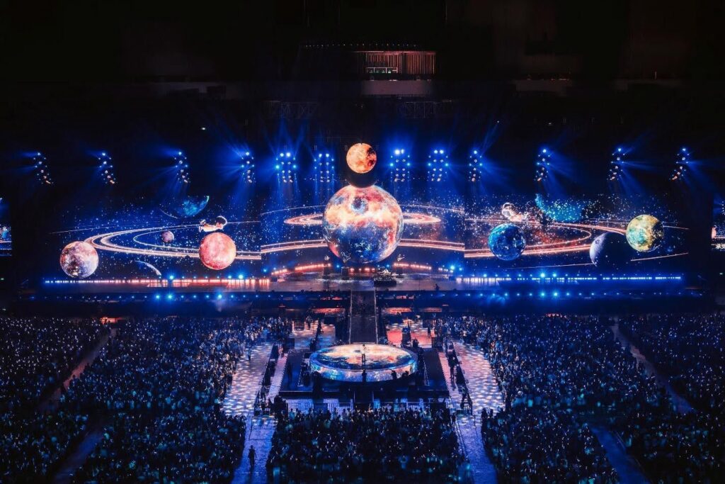 本次巡演倾力打造,再度呈现 「5懈可击」 的顶级音、光、影盛宴。以 「时间胶囊」 为创作核心,全新巨型主舞台——「天外有天·时光机」 震撼亮相。舞台由超过 15,000 片特制三维曲面LED 屏精心组合,搭配 Disguise 多媒体系统,呈现媲美 16K 画质 的沉浸式视觉体验。现场还设有五颗漂浮装置 「神的孩子都在跳5球」 延伸舞台视觉,营造出极具未来感与空间层次的视觉奇观。
