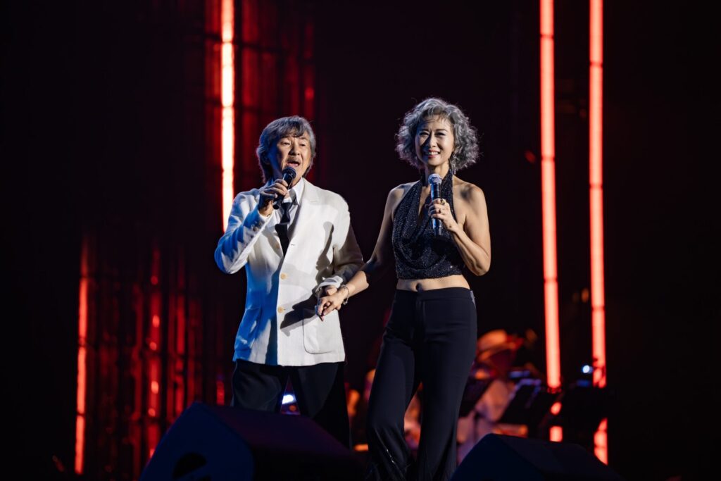 葉蒨文的个人表演同样掀起高潮。她不仅带来《我要你的爱》、《真心真意过一生》、《信自己》及《情人知己》等经典歌曲,还特别献唱全球热唱的《APT》。在舞蹈员的带动与教学下,台下观众纷纷跟着节奏起舞,现场气氛瞬间化身大型蹦迪现场。当话题转到已故父母时,现场气氛也变得格外感性。葉蒨文以《蓝天》表达对父母的思念,而林子祥则演唱《追忆》、《单车》和《空凳》缅怀父母。大屏幕同时播放两人与父母的珍贵影像,两人也借此呼吁大家放下手机,多陪伴父母,珍惜眼前人。