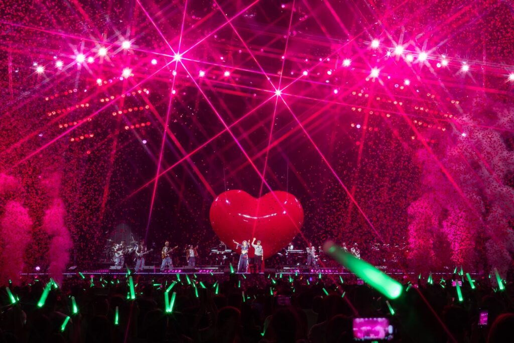 整晚演出中,两人台上互动频频,不时牵手、拥抱,甚至甜蜜亲亲,大方“撒狗粮”,羡煞全场歌迷。两人之间的默契与幽默更成为演唱会的一大亮点。