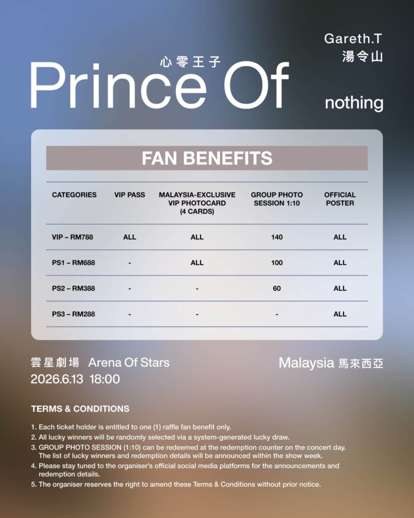 RNATIONAL 協辦,《Gareth.T -Prince Of nothing 湯令山 – 心零王子 》馬來西亞,於2026年6月13日(星期六),傍晚 6 點,正式登陸雲頂世界雲星劇場。