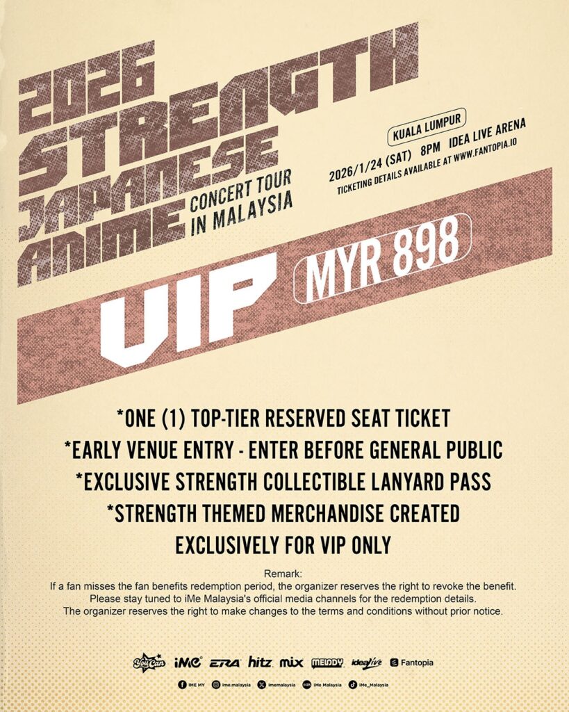 日本动漫迷的福音来了!汇聚五大经典动漫主题曲原唱阵容的《2026 STRENGTH JAPANESE ANIME CONCERT TOUR IN MALAYSIA》,将于 2026 年 1 月 24 日(星期六)在 IDEA LIVE ARENA 盛大登场!这场超次元的动漫音乐盛典,将以震撼的现场演出,带领观众穿越日本动漫的黄金年代,重温无数热血与感动!
